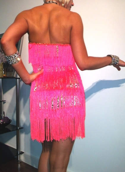 イギリスの豹柄の生地に鮮やかなピンクのフリンジがよく踊るドレスです。アクセサリーは豹柄でフロアで個性が光ります。たくさんのスワロフスキーのストーンが生地の上にちりばめられています。