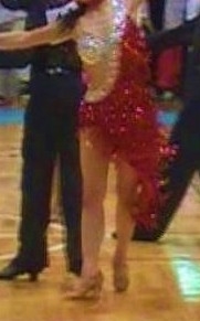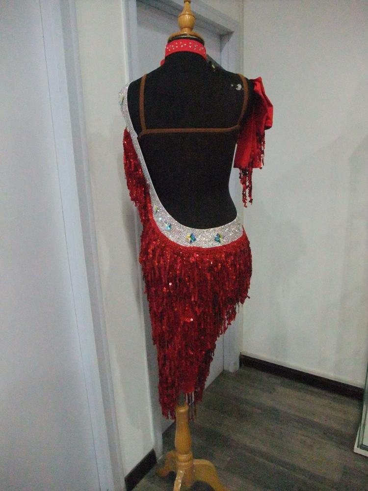 赤のスパンコールフリンジと、白色部分についてる大きいスワロフスキーが、フロアでとても目立ちます。(下腹部がフリンジで隠れて目立ちません。)