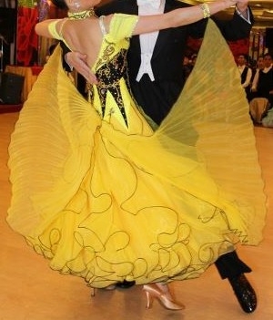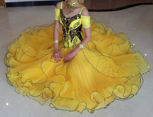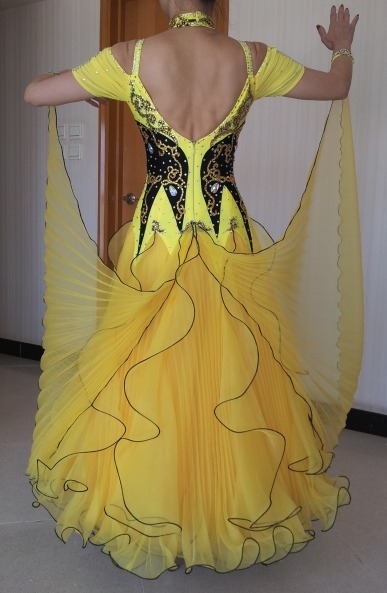 2012年の7月に制作されたもので状態は非常に良いです。特徴的なデザインのボディとモチーフはスワロフスキーのストーンで飾られています。スカートはボリュームがありギャザーがたくさん入っているのでよく舞い、とても着心地のよいドレスです。