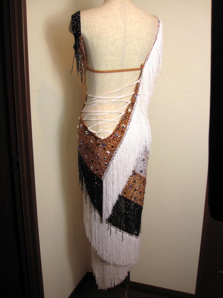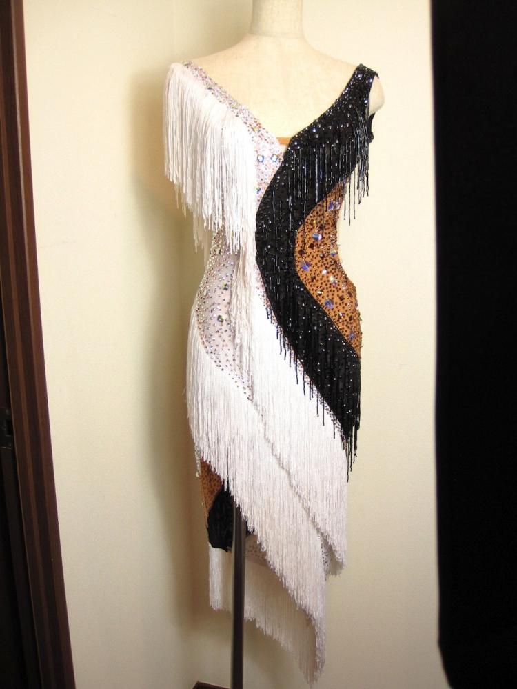こちらのドレスはメルマガ掲載にて売り切れました!ご興味のある方は是非メルマガをご購読ください! グランドスラムラテンでセミファイナリスト、スロベニアのカップルDamir Haluzan - Ann Mashchyts組のCBMの最新スポンサードレスです。白黒のフリンジがとてもよく踊り、豪華で目を引きます。角度によって様々な表情が楽しめるドレスです。スワロフスキーはホットフィクスのものが使われているので取れにくく洗うことが出来ます。