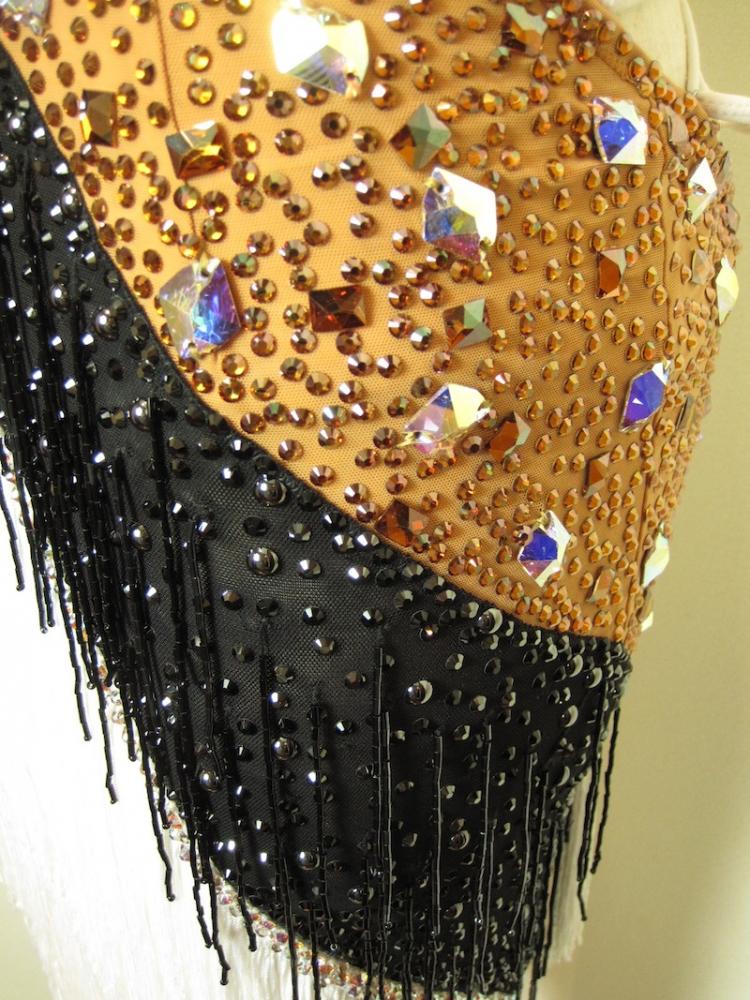 グランドスラムラテンでセミファイナリスト、スロベニアのカップルDamir Haluzan - Ann Mashchyts組のCBMの最新スポンサードレスです。白黒のフリンジがとてもよく踊り、豪華で目を引きます。角度によって様々な表情が楽しめるドレスです。スワロフスキーはホットフィクスのものが使われているので取れにくく洗うことが出来ます。