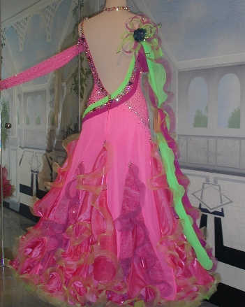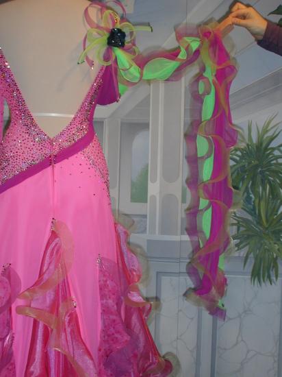 イタリアらしいとてもきれいなピンクと、グリーンをアクセントにきかせたドレスです。上半身はストレッチ素材、スカートはジョーゼットとオーガンジーを使用しており大変よく踊ります。ストーンはスワロフスキーを約50G使用しております。 附属品:ネックレス、イヤリング、ヘアアクセサリー、ドレスカバー