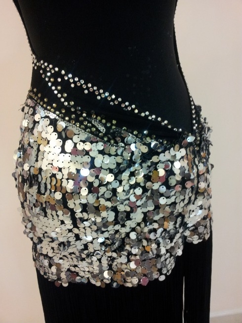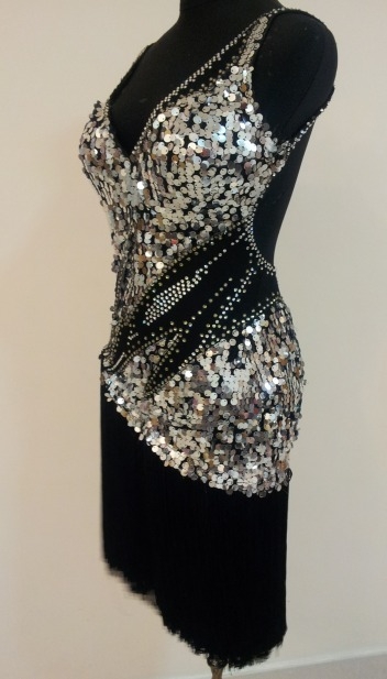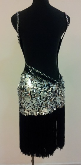 スワロフスキーのストーンとクリスアンの生地が使われています。オーストラリアで制作されました。スパンコール生地なのでよく光り目立ちます。ボディには斜めにカットが入りストーンがつけられています。スカートはフリンジなので踊った時によく振れます。