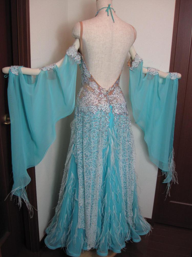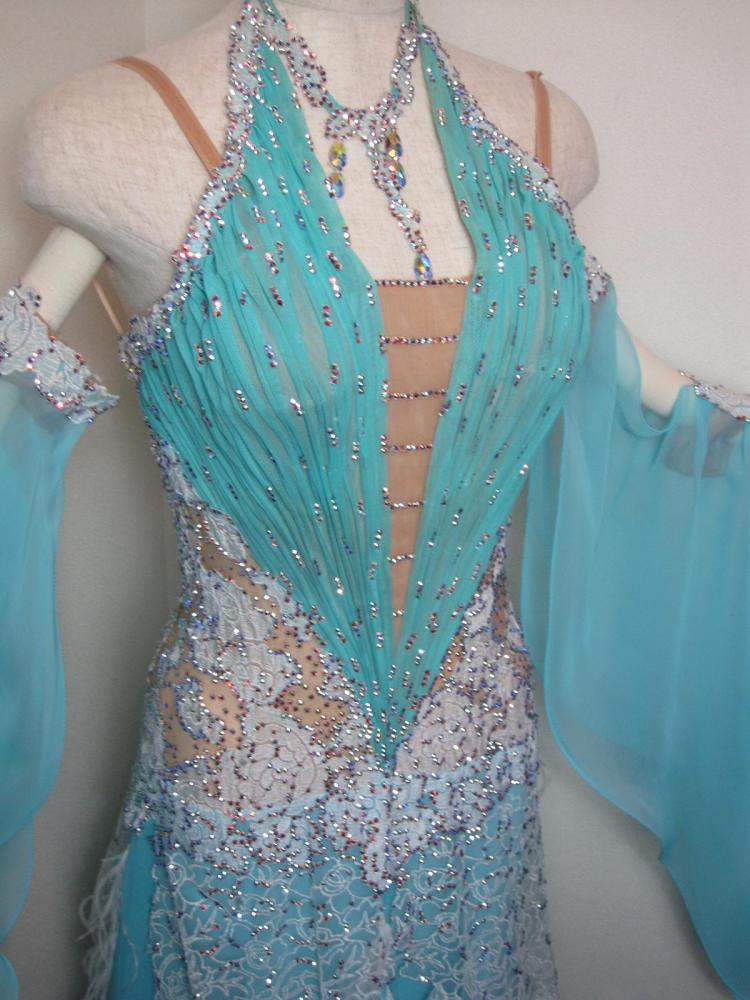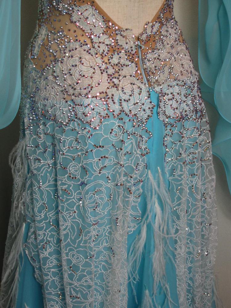 細かく縦についた羽や細かいデティールがサピエルらしいドレスです。レース部分に大変細かくスワロフスキーをちりばめてあり、とてもエレガントな感じです。外国人選手スポンサードレスブラックプールにて購入。