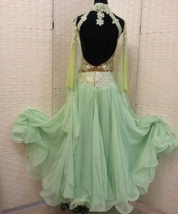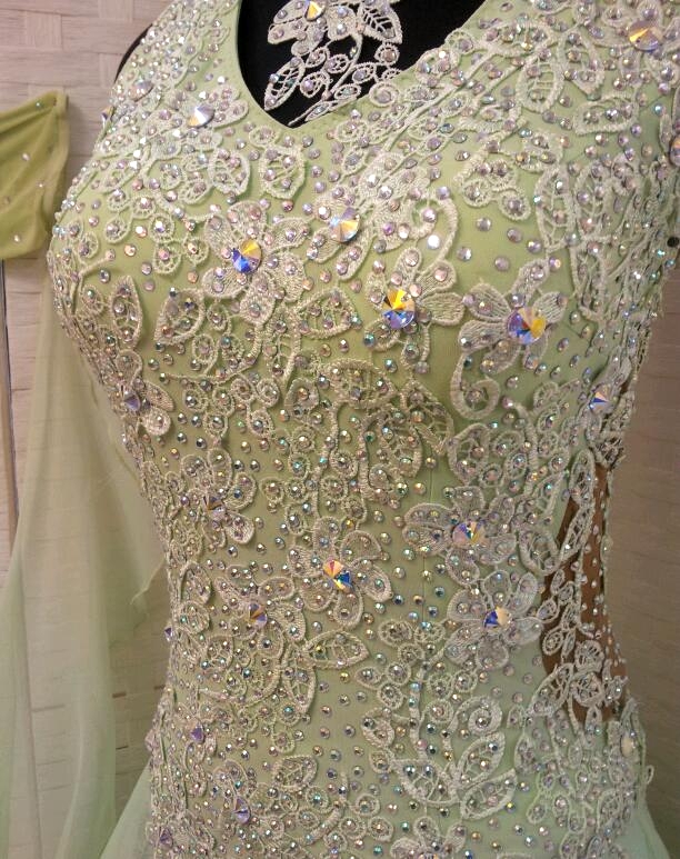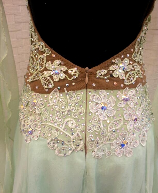 ミントグリーンの柔らかいイメージのドレスです。ボディにはたくさんのモチーフとアクリルのクリスタルストーンが使われています。ボディに貼られている大きなストーンはスワロフスキー製でとてもよく光ります。ホルターネックでデコルテをきっちりカバーしてくれます。