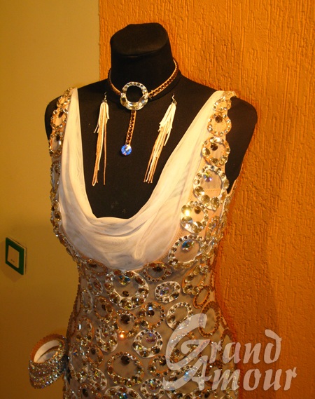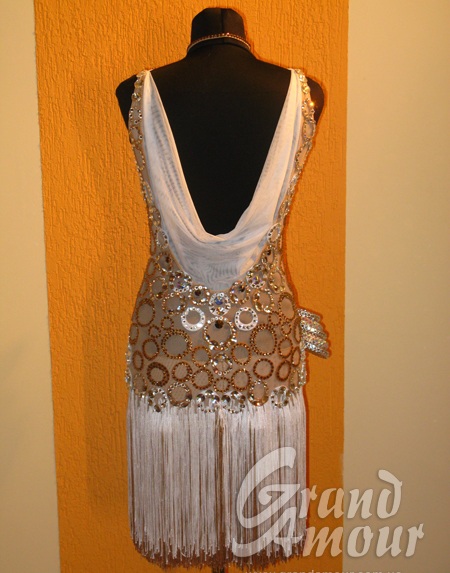 ウクライナの美しいドレスメーカーGrand Amourのドレスです。 ボディにびっしり付いたモチーフとストーンが非常に豪華でよく光ります。胸元と背中に付いている布が、体のボリュームを増長させる効果があり、細めの方にもいいと思います。未使用の新品のため、とても綺麗です。フリンジは通常のリリアンタイプのものと布地のものがついており、動くと違った揺れ方をして斬新です。Grand Amour初期のころの作品のため、新品でこの価格でご提供できます。とてもいいドレスだと思います。