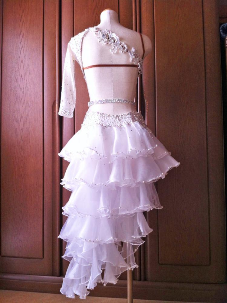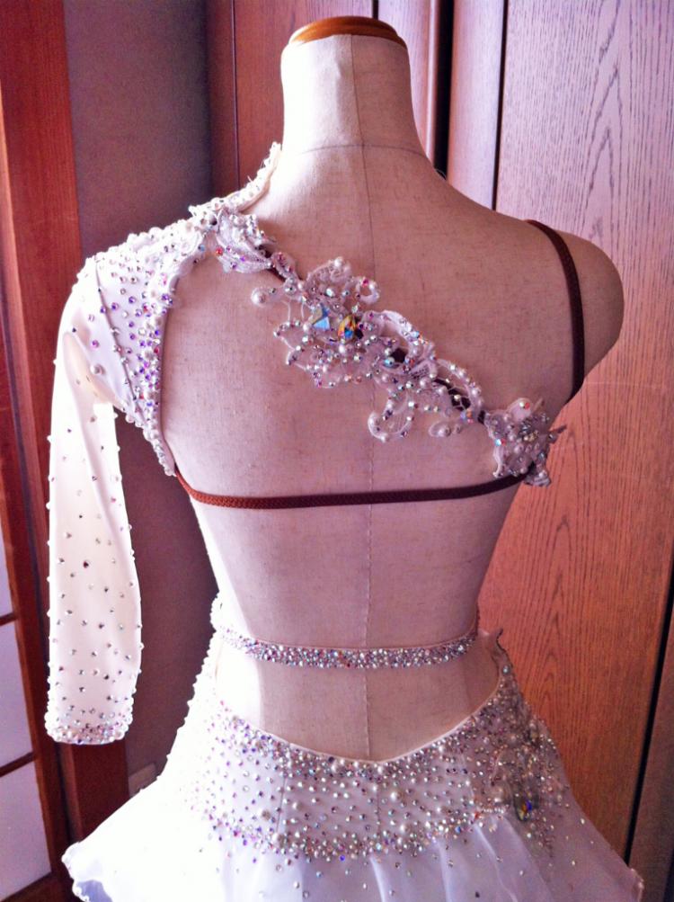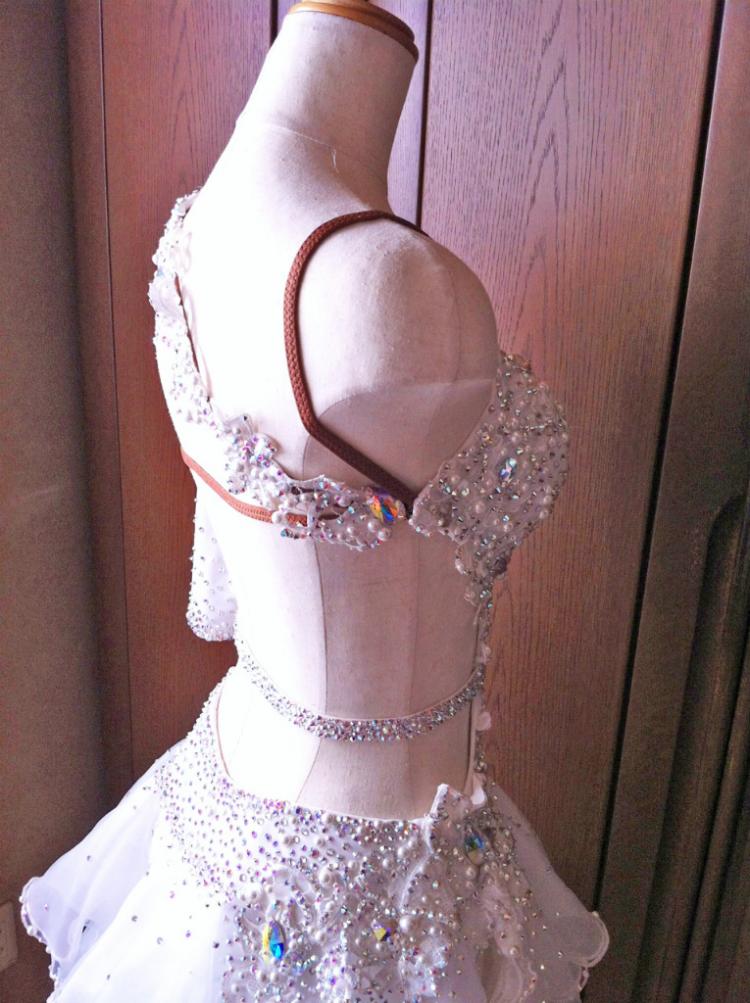2012年8月、タカダンスファッションにて作成。自宅で手洗いが出来るメンテナンスが容易なドレスです。コンペ時にドーランなどが少しついた際は会場ですぐに部分洗いすれば、色はつきませんでした。ボディはストレッチ素材(ファスナー無し)スカートは数種類のオーガンジーで出来ています。非常に軽くフリルが沢山あるためスカート捌きが容易なドレスです。フリルの先端には動きが出やすいようフラットパールで重さを出しています。装飾はすべてクリスタルクローバー社のレースモチーフおよびスワロフスキー社のオーロラAB、クリスタル、パシフィックオパール(計50グロス)および大小のフラットパールが使われているため白一色ですが単調な印象を与えません。さらに腕輪とベルト前面にスワロフスキーがびっしり貼ってあるので大変豪華です。タカのドレスカバーとドレスバッグをお付けいたします。