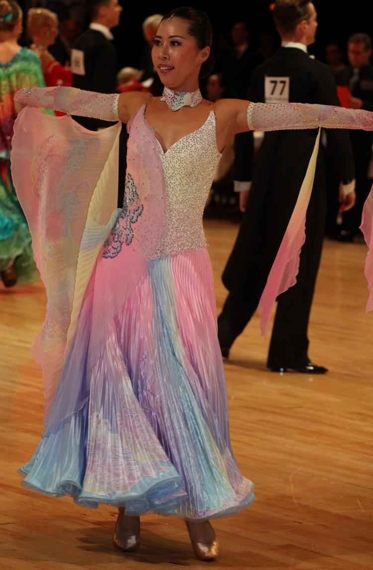 白、イエロー、ピンク、ブルー、パープルの5色を使い、色味はまるで淡いレインボーのようなドレスです。スカートとフロートには波が描かれています。スカートとフロートの素材は光沢のあるプリーツで光が当たるととてもきれいです。着心地はバッチリです。縫製が丁寧なのでドレスボディの裏地もしっかりしています。イギリス在住のロシア人デザイナーにフルオーダーしてもらい32万円で購入しました。購入したのは2年前ですが、今でも新しいドレスなの?と間違われるほど状態はいいです。このデザイナーが作るドレスは石落ちが少なく、一部落ちてしまったところも補修済みです。クリーニングも済みです。