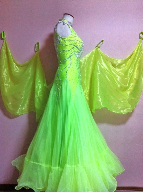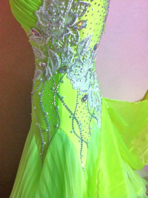 白のモチーフレースを使ったやさしい雰囲気のドレスです。ボディにはたくさんのプレシオサラインストーンを使用しており、スカートの幅も広くて、踊るととてもよく舞います。とにかくとても軽やかなドレスです。ネックレス、ドレスカバー付きです。