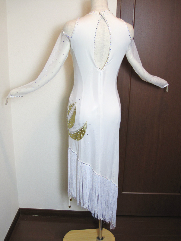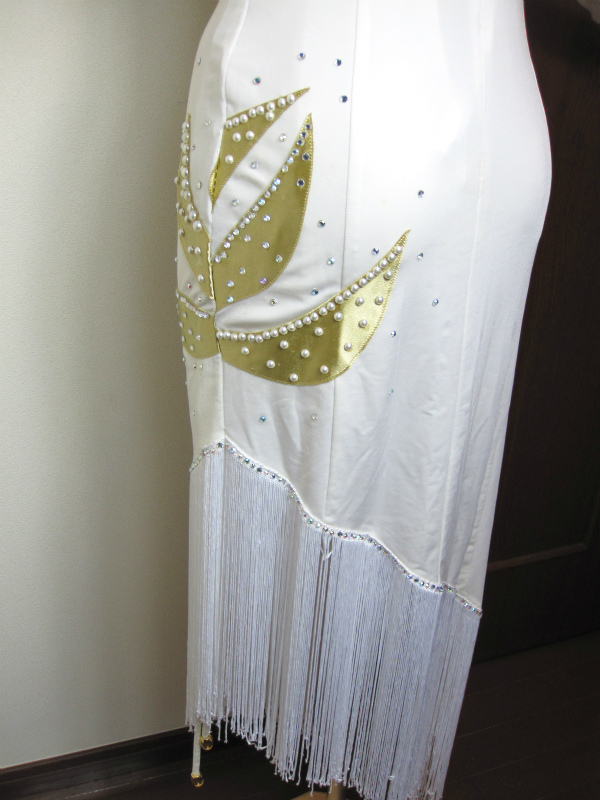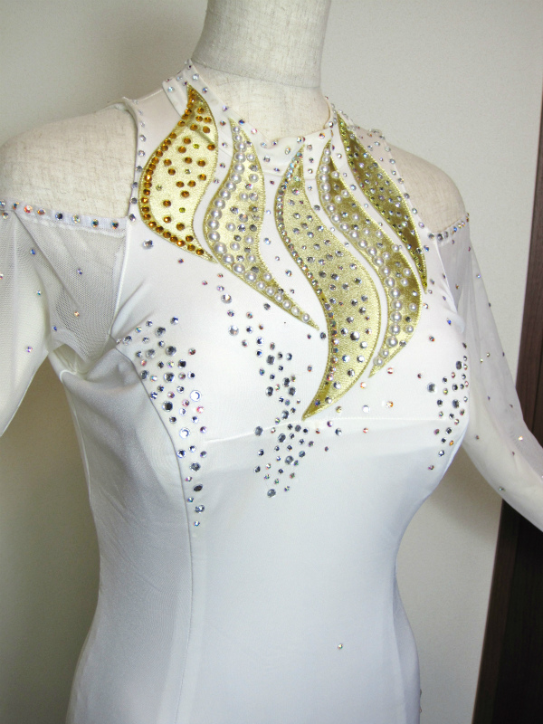ホルターネックでスタイルよく見えます。胸元にはゴールドのモチーフがついていてストーン、パールが貼られています。