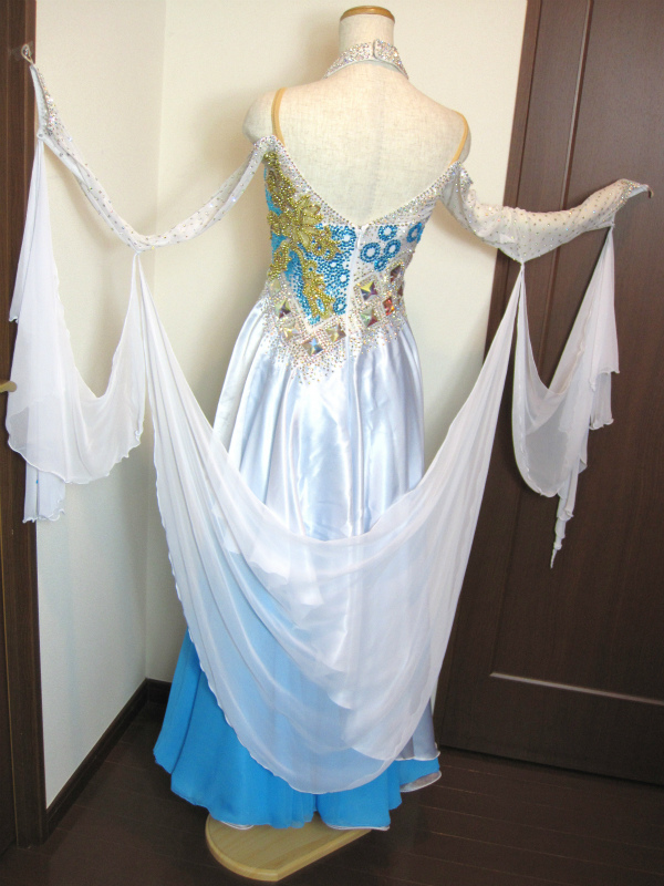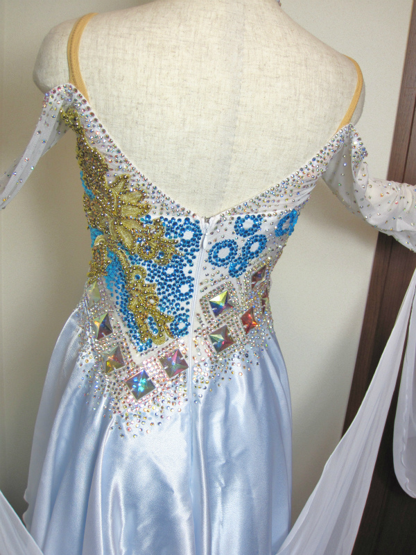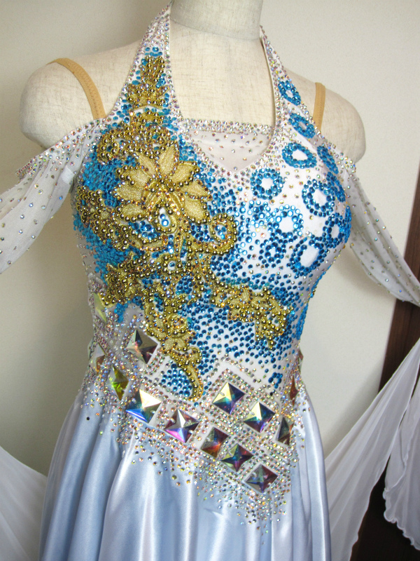 ボディ部分には青、オーロラのストーンやゴールドのモチーフがたっぷり使われていて豪華です。特にウエスト回りは大きな石がたくさん貼られています。スカートは水色の白の2色が使われていて個性的です。