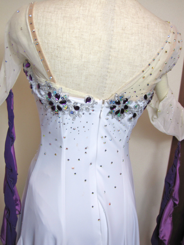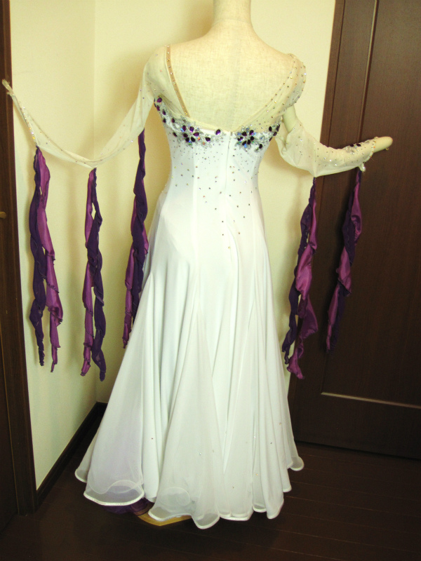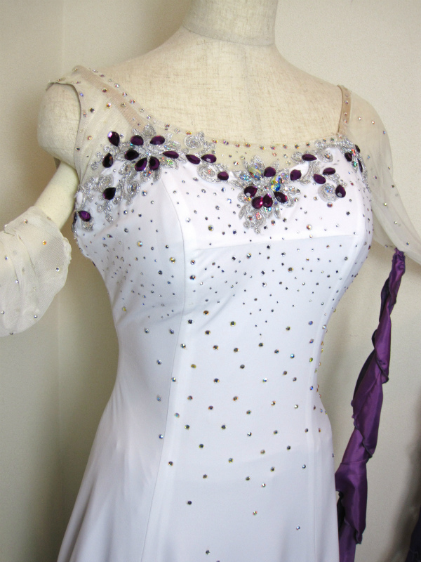 白地のドレスに紫のフロートが使われているドレスです。胸元にも紫のストーンが使われています。袖もついているので露出を控えたい方にもおすすめです。紫のペチコート付。