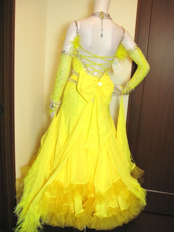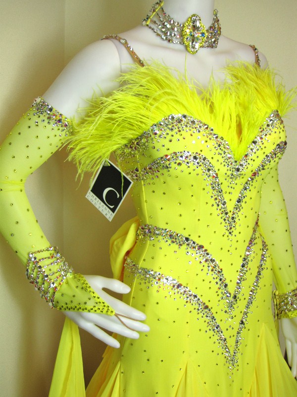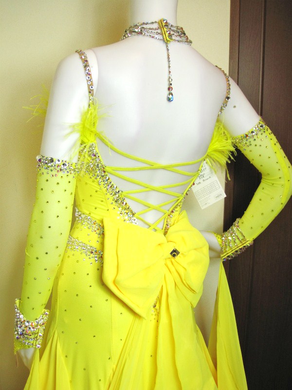 クリスアンらしいとても豪華なつくりのドレスです。鮮やかな黄色がフロアでとても映えます。スカートには布がたっぷりと使われ複雑なカットになっているのでよく広がり、舞います。フロートや胸元には羽があしらわれ、ボディはスワロフスキーのクリスタル、クリスタルABの石が大小織り交ざってラインを描いています。チョーカーやフロートにつながっている腕飾りにも石がびっしりと貼られています。背中は紐の編み上げがあり、ヒップの部分には大きなリボンが付いていて後姿もとてもキュート。ボディや手袋には黄色の石もちりばめられていてとてもゴージャスです。