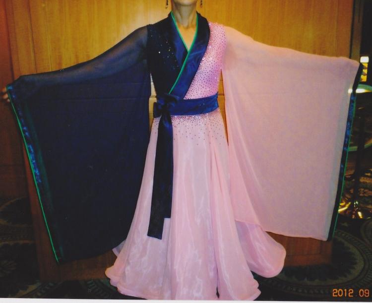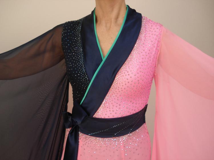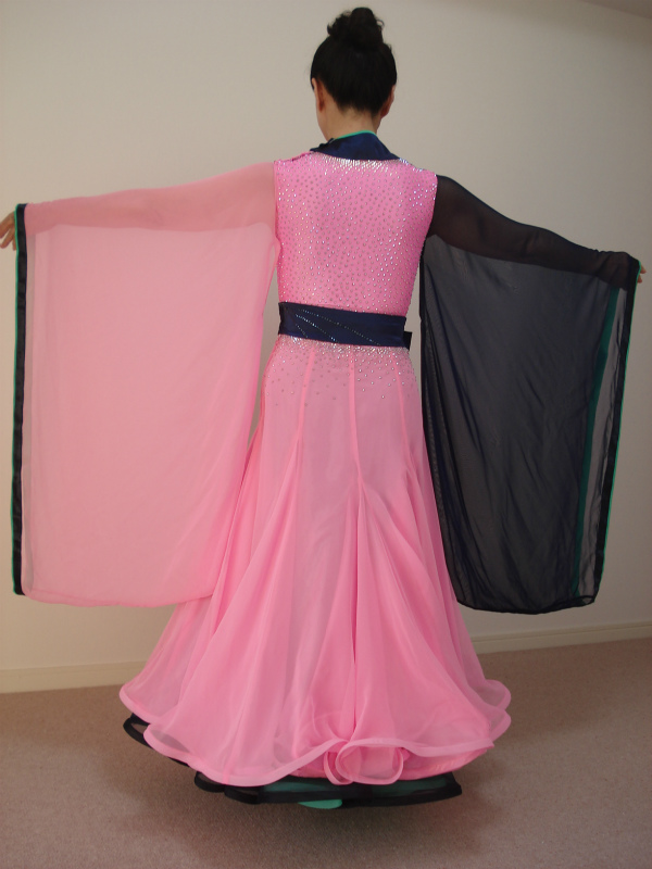 着物をイメージしたオリジナルドレスです。ピンクとネイビーのコントラストがシンプルながらも美しく、デモなどにぴったりです。 購入金額は367500円でした。