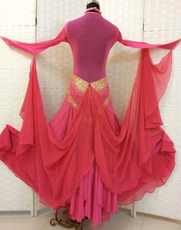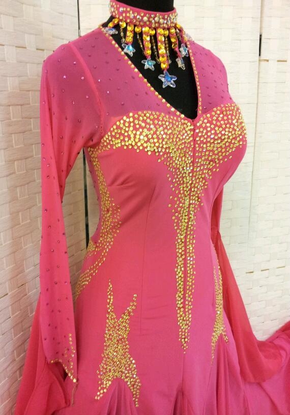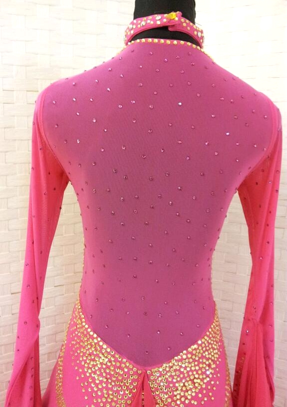 濃いめのピンクのドレスです。スワロフスキーのストーンとクリスアンの生地が使われています。肩から背中にかけてはネット素材が使われていてボディを美しく、セクシーに見せてくれます。