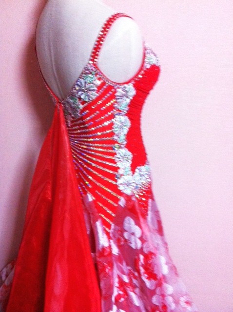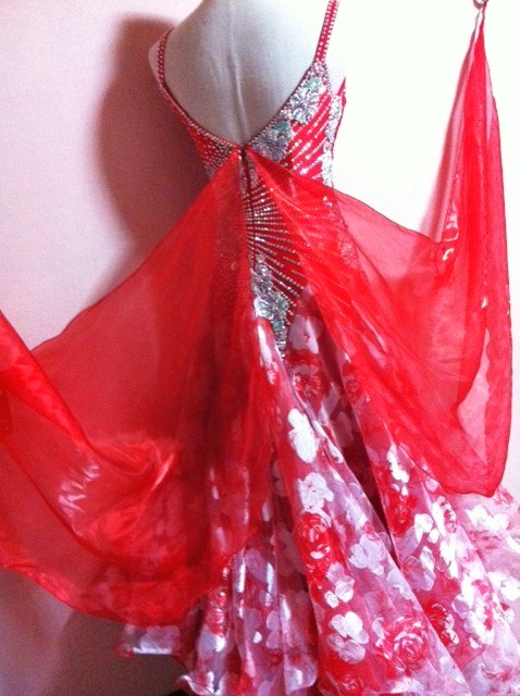 バラのモチーフレースを使ってやさしいドレスです。ボディにはたくさんプレシオサラインストーンを使用しており、スカートとフロートの幅も広くて、踊るととてもよく舞います。とにかくとても軽やかなドレスです。ネックレス、ドレスカバー付きです。