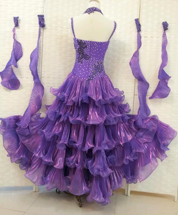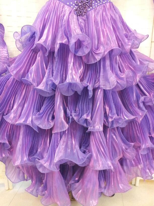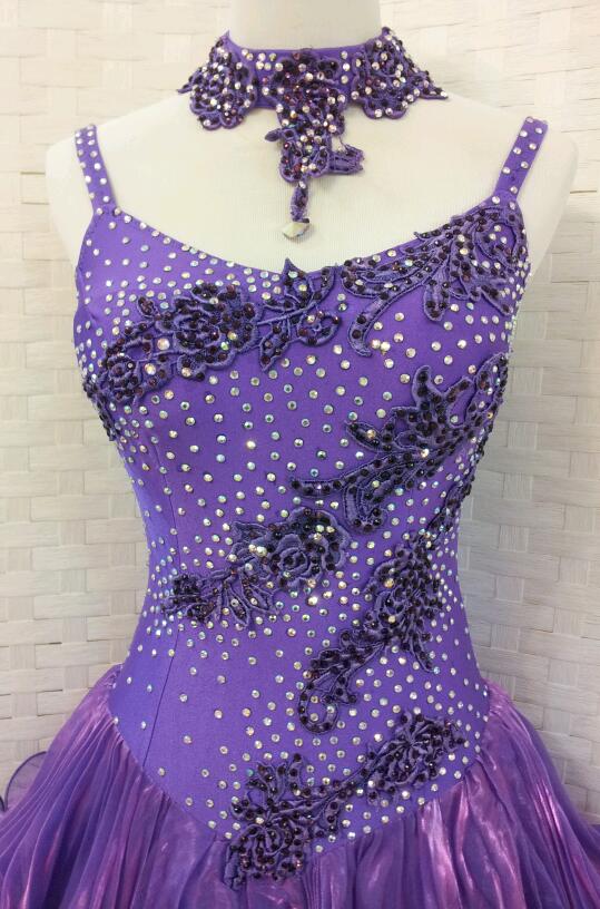 スカートが5段重ねでとてもボリューミーなドレスです。スカートやフロートの生地は細かくギャザーが寄っていて膨らみのある舞い方をします。ボディにはたくさんのクリスタルのストーンが貼られています。フロートは2種類ついてきます。