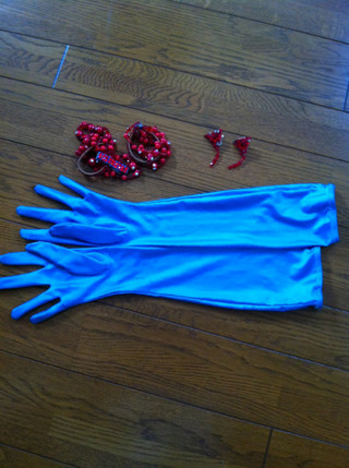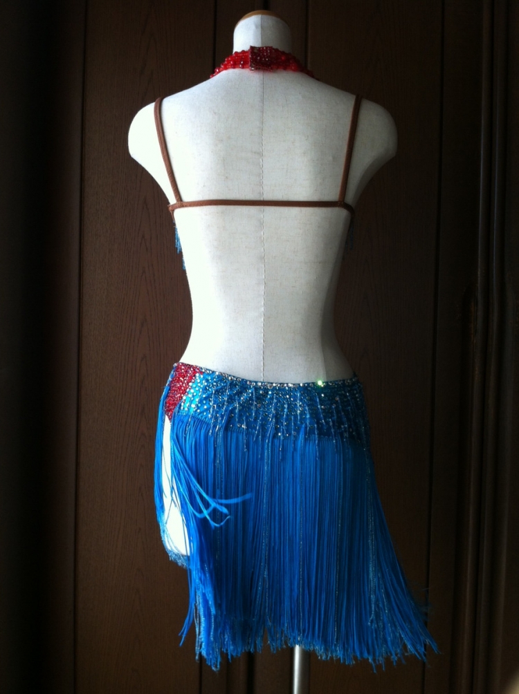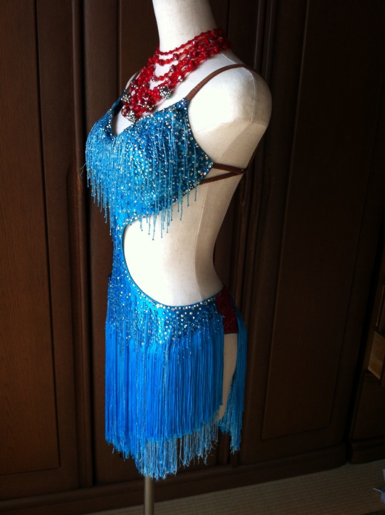 全体に石と竹ビーズがたくさんついています。水色のボディと赤の首飾りのコントラストが印象的です。付属品:イヤリング・グローブ・ネックレス・腕輪 二個