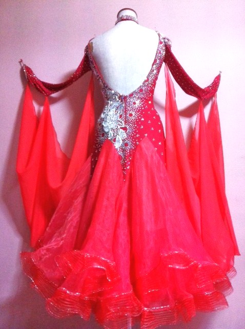 全身がスワロフスキーのラインストーンとランドラインストーン大量使用で輝くドレスです。とてもシックで豪華なイメージです。スカートは3枚ですべてにホースヘアがついており、軽くよく踊ります。