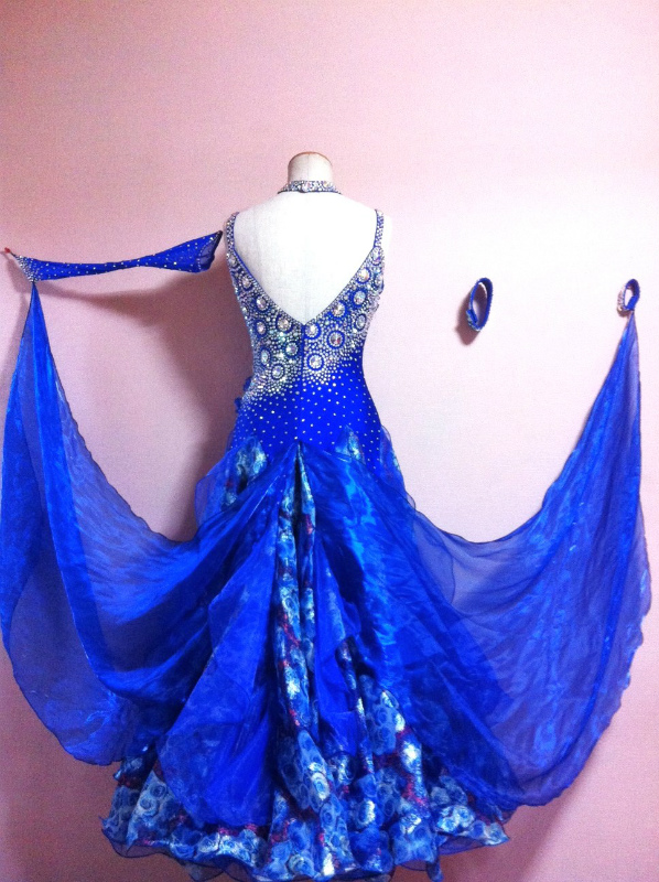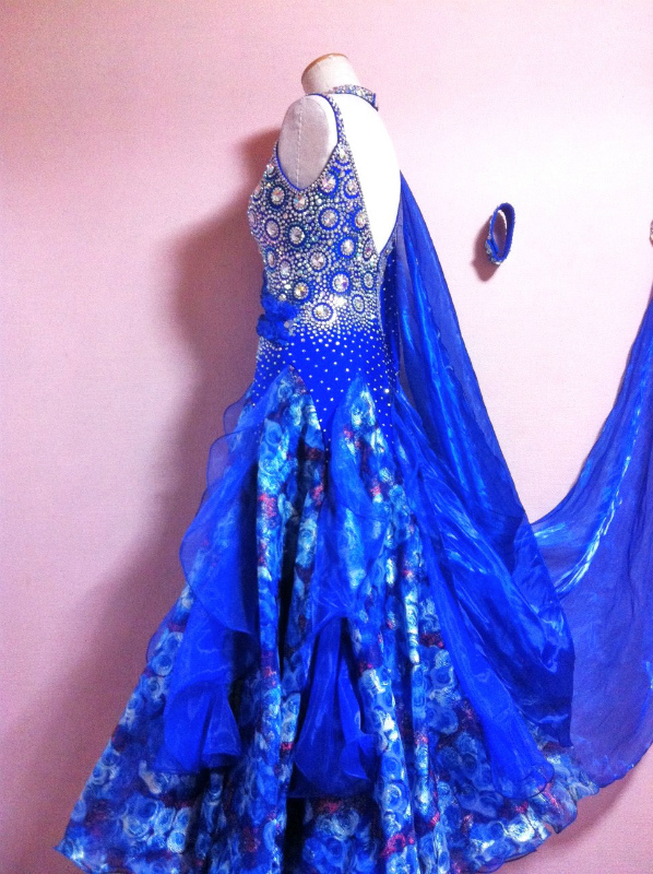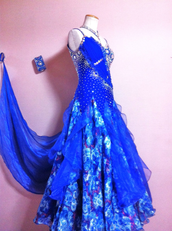 ロイヤルブルーが非常に目立つドレスです。ラインストーンが豪華に使われており、見る角度によって印象が違います。バラ柄のスカートの裾にフリルがついており、よく踊ります。