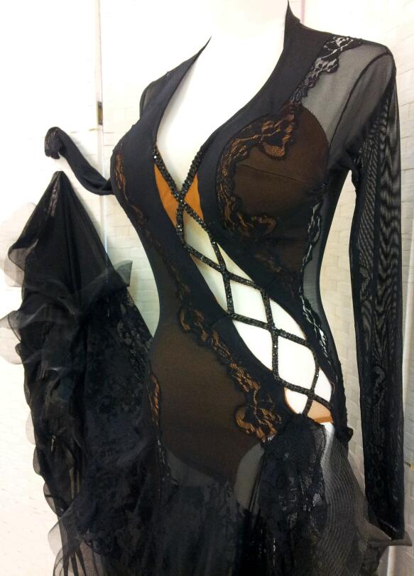 スワロフスキーのストーン、クリスアンの生地とレースが使われたハイクオリティーなドレスです。ロング丈の長袖で一見露出が少ないように見えますが、透け素材が使われていてとてもセクシーです。びっしりと石が貼られた紐が胸元からサイドにかけてクロスさせてあり、そこからは肌が見えます。スカートやボディにたっぷりと使われたレースがとても美しい、他に類をみないドレスです。