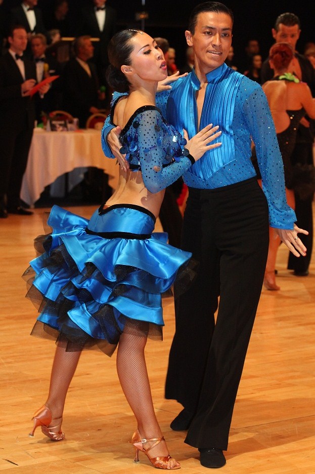 ブルーの上下セパレートのドレスです。スカートはブルーサテンを使っていてとても艶やかです。色がとにかく鮮やかなので、暗いフロアでも明るいフロアでもかなり目立ちます。裾には黒いホースヘアが付いていて、スカートのボリュームが結構あります。