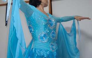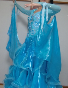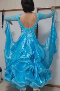 色が素敵なドレスです。石はスワロフスキーが混じっています。ボディ部分が美しく、スカートは光沢がありボリュームがあるので目立ちます。