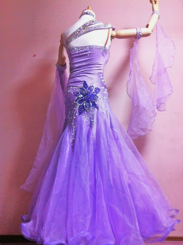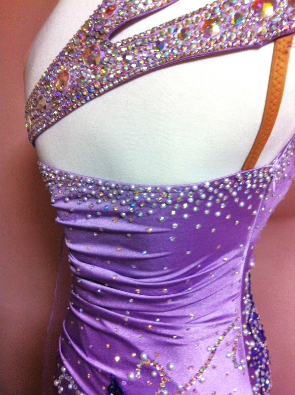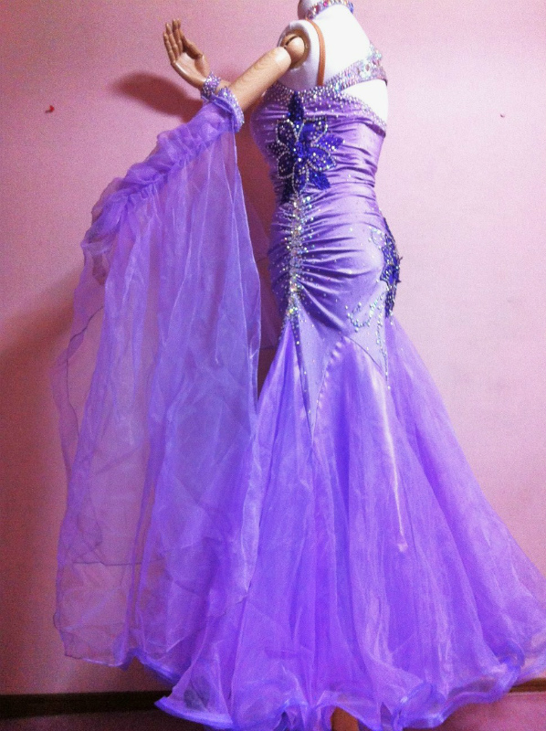 籐色が珍しいカラーのドレスです。ラインストーンが豪華に使われており、見る角度によって印象が違います。腰のまわりがギャザーのデザインで、すごく細く見えます。スカートも軽い素材を使っており、うまく踊ります。