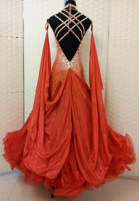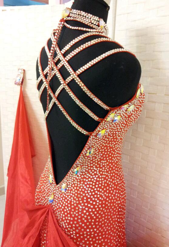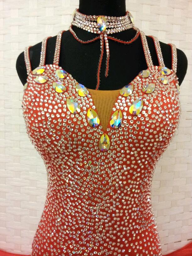 ボディにびっしりとスワロフスキーのストーンが貼られた豪華なドレスです。布は美しいクリスアンの生地が使われています。肩ひもは3本ずつついていてそれが背中で交差するような作りになっています。チョーカーにも石がびっしりついていてよく光るドレスです。