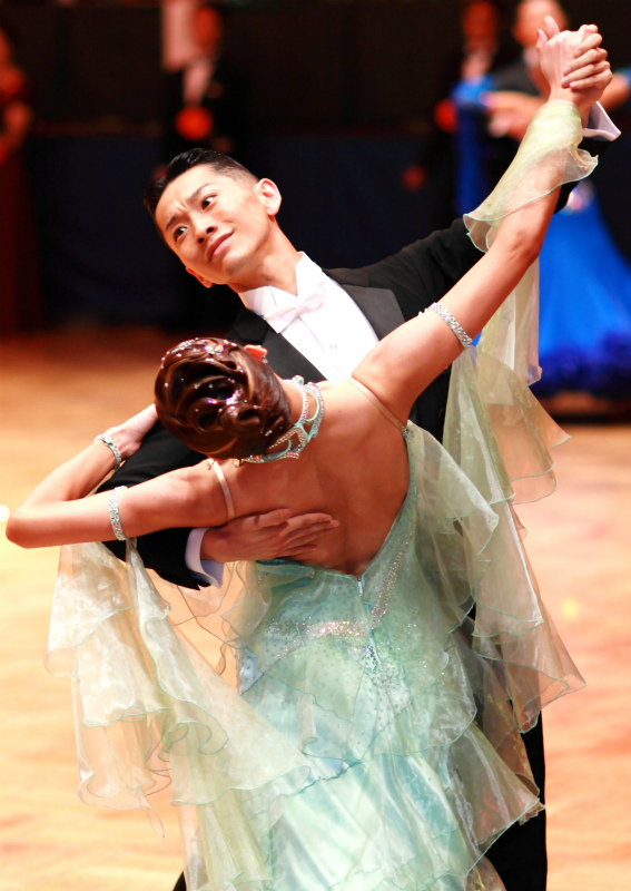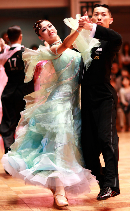 世界ファイナリスト、バレリオ・コラントーニのパートナーのユリアがUK選手権で着用したドレスです。裾にむかって広がるラインがとてもきれいなドレスです。スカートのボリュームを持たせていますが、とても軽く踊りやすいドレスです。