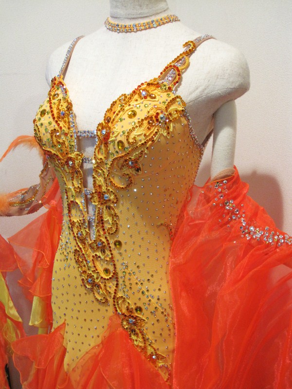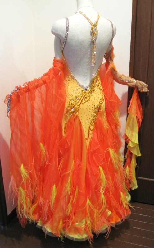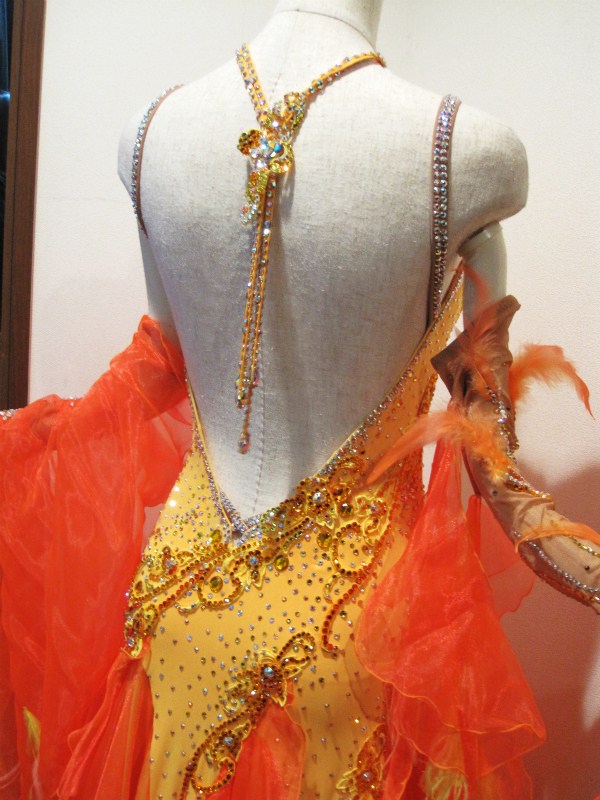 軽くてよく踊ってくれるドレスです。発色が良くとても明るいドレスです。モチーフには石がびっしりと貼られ、グローブやフロート、スカートには羽根が散らされています。フロートは左右で違う形です。