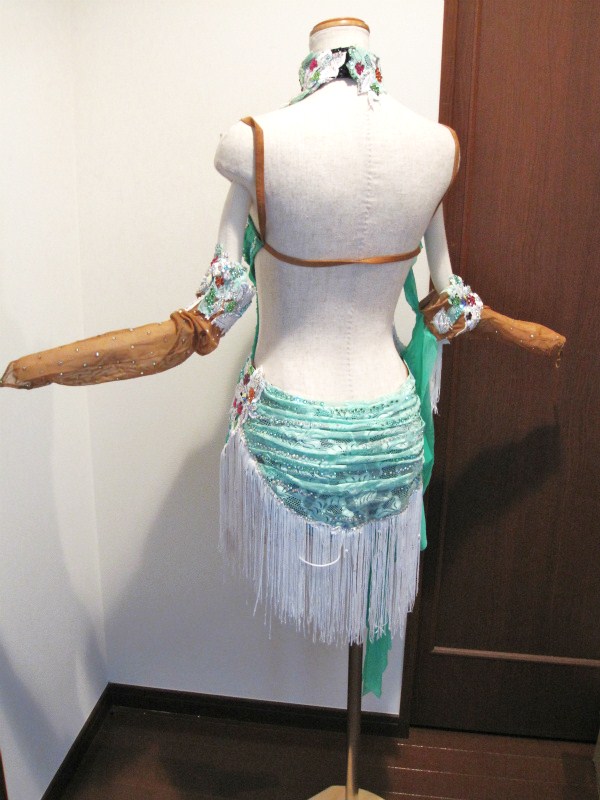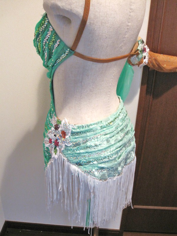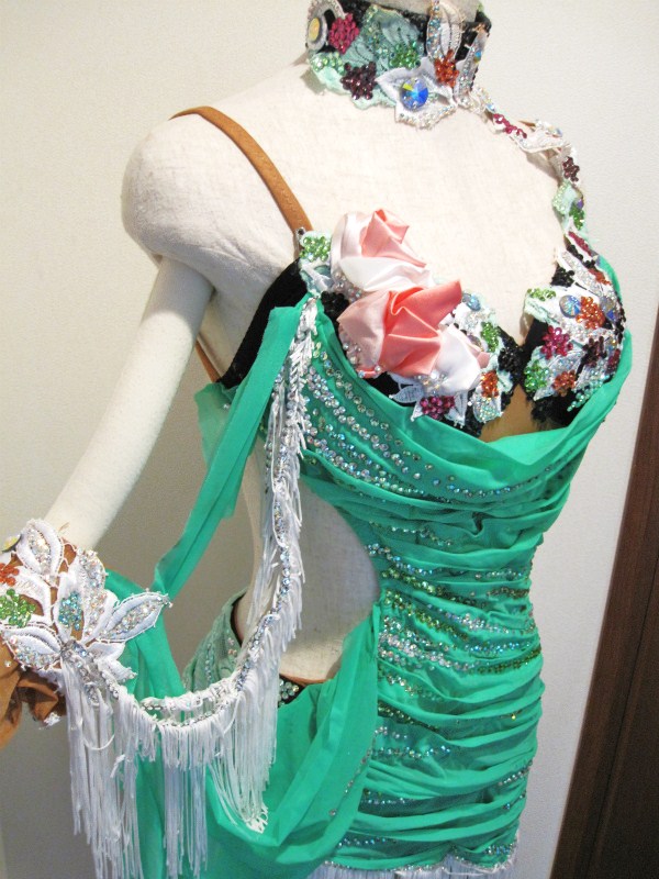 とても綺麗な緑で肌映りが良いです。個性的な形をしていてギャザーの寄った緑の布に白いフリンジがよく踊ります。イヤリング付属