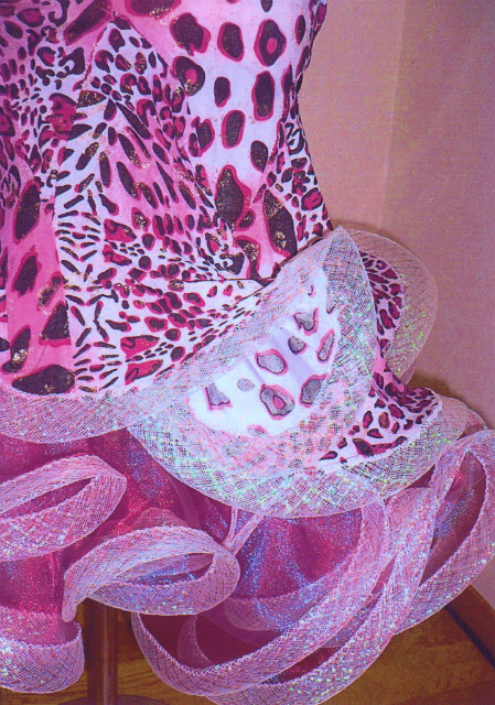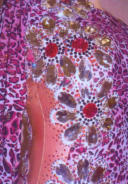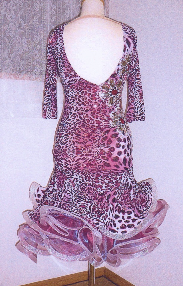 大きな石をたくさん使って描かれたお花のデコレーションが豪華でインパクトのあるドレスです。ドレス全体にはピンクと赤に光るオーロラの石が貼られています。サイドの大きな花の石びっしりのオーナメントが非常に豪華です。スカートはボリュームたっぷりのパニエ型のオーガンジー素材のスカートが数段入った、とてもよく踊る美しいデザインです。裾にはオーロラが入った美しいソフトボーンがつけられています。アクセサリーとして、バングル2本が付属しています。