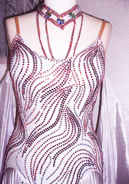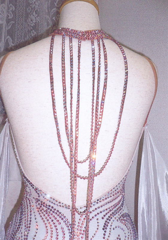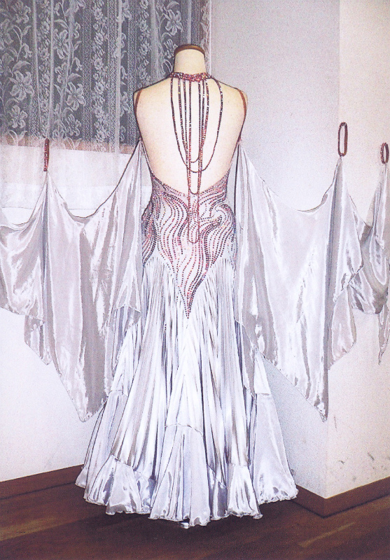 ボディに描かれた絵柄が大変美しいシルバーのモダンドレスです。すべてスワロフスキーの石を使って流れるような絵柄がボディ全体に描かれていて、非常に上品で豪華に輝く美しいドレスです。スカートはアンダースカートが入ったボリュームたっぷりのデザインです。プリーツ加工された外側に非常にインパクトがあり、裾にはフリルがつけられています。胸元と背中の石のチェーンがとても印象的で、豪華で美しいチョーカーが付属しています。