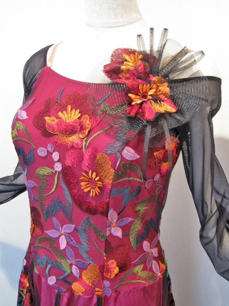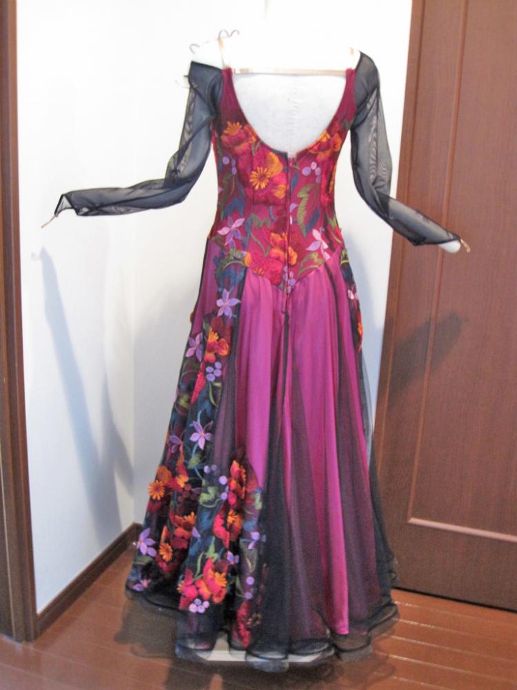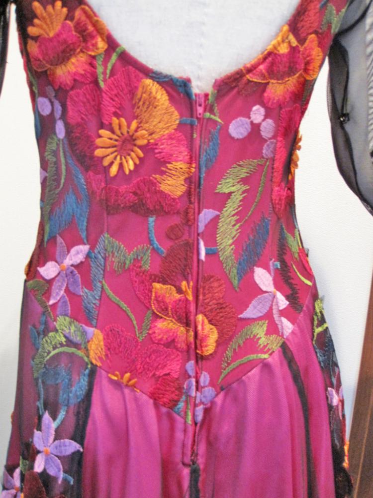 レース地にカラフルな刺繍が一面に施されたとても手のこんだドレスです。内側には色違いのペチコートがあります。肩ひもで詰めていますが、戻せます。