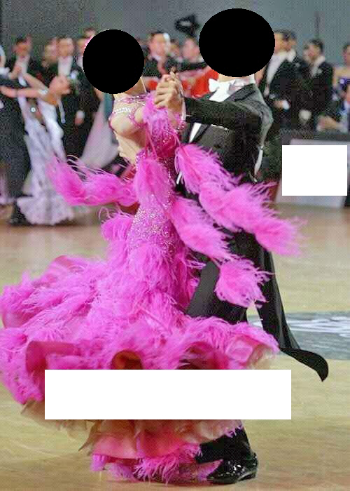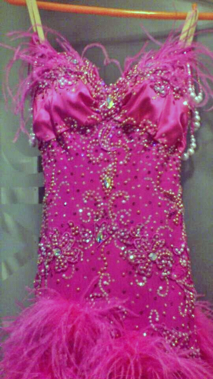 フロートとスカートに羽根がたっぷり使われた豪華なドレスです。ショルダーにはパールの肩紐が2本ついていて可愛らしいです。ボディは胸元で切り返しがあり、モチーフの上にたくさんのスワロフスキーのストーンが使われています。クリスアンの生地が使われています。