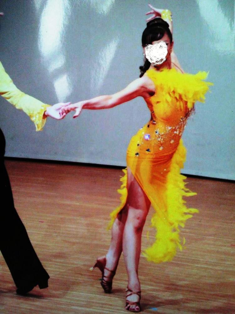 ボディは黄色のライクラが使われ、ターキーフェザー、スワロフスキーのストーンがたくさんつかわれています。イヤリング、バングル付属。