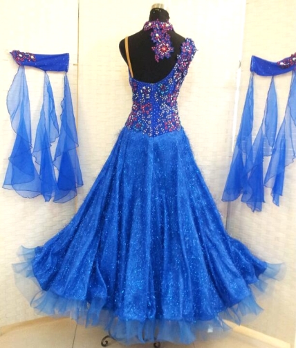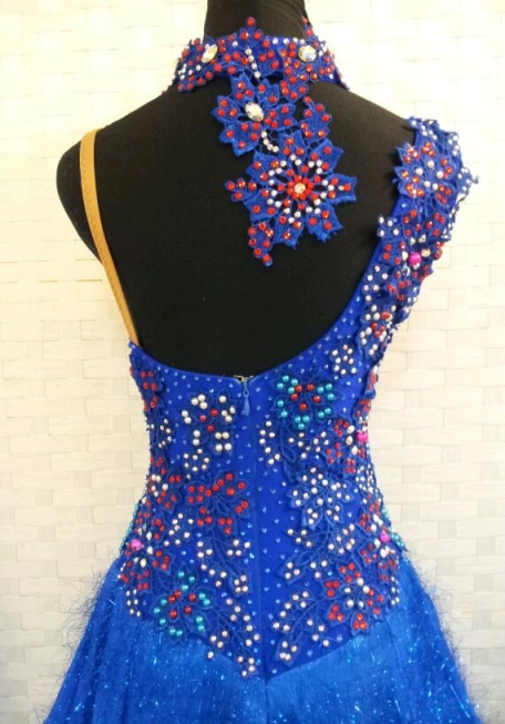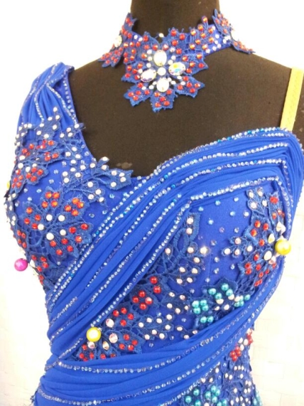 ネックレスとボディにスワロフスキーのストーンとパールが貼られたモチーフがたくさん使われたドレスです。スカートは特殊な光る生地が使われていて個性的です。