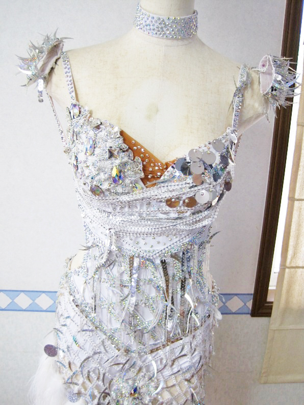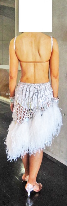 ヨーロッパの選手から購入後2回着用しただけですが、白のドレスですので内側の見えない部分にタンニングローションの後があります。ドレスはスパンコールのついたテープのようなもの張りめぐらしてネットのようにした裾にファーをあしらっています。ボディーもスパンコールとストーンをたくさん使っていて、よく輝くドレスです。