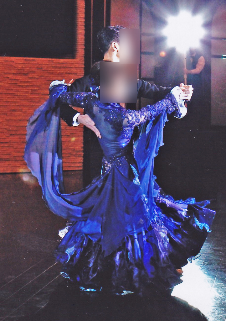 バックスタイルが印象的で非常にエレガントなドレスです。スカートも適度にボリュームがあり、きれいなラインでよく踊ります。