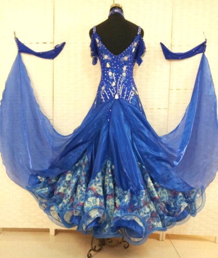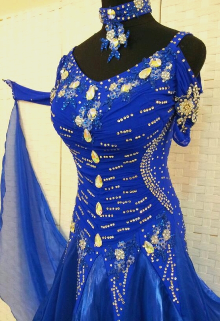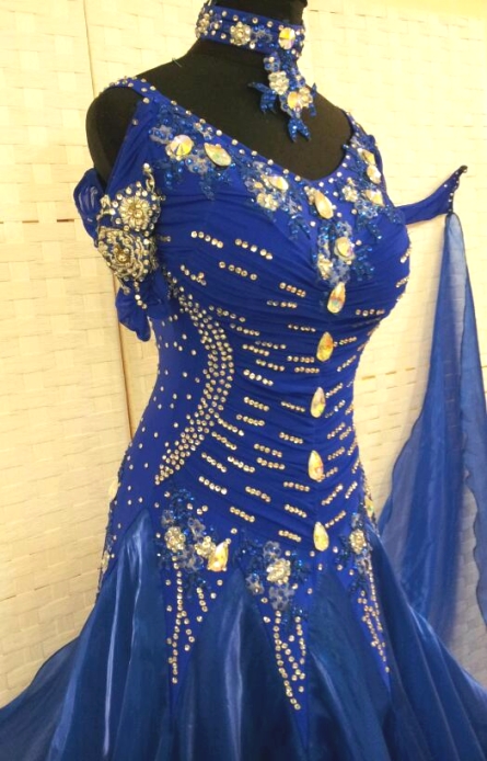 クリスタルの石(スワロフスキーではありません)がたくさん散りばめられたオフショルダーのデザインの可愛いドレスです。たっぷりとボリュームのあるスカートの下のほうは柄布が使われていてインパクトがあります。