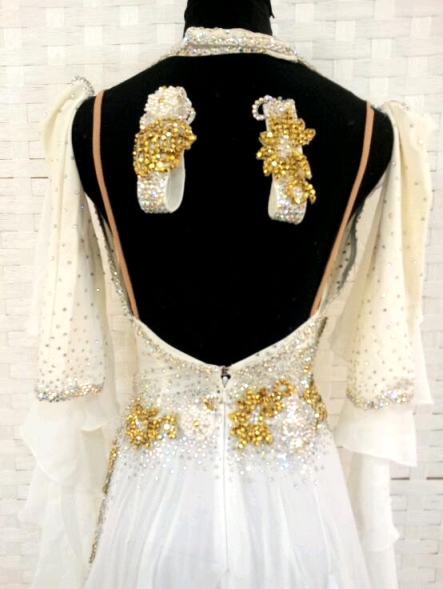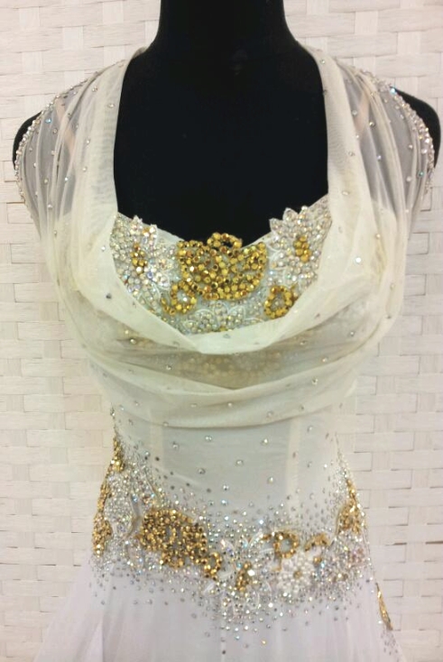 細身の方によくフィットするチョイスロンドンのドレスです。モチーフにはびっしりとオーロラと金のスワロフスキーのストーンが貼られています。スカートはソフトシフォンの布が使われています。