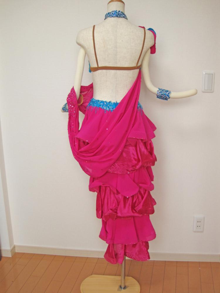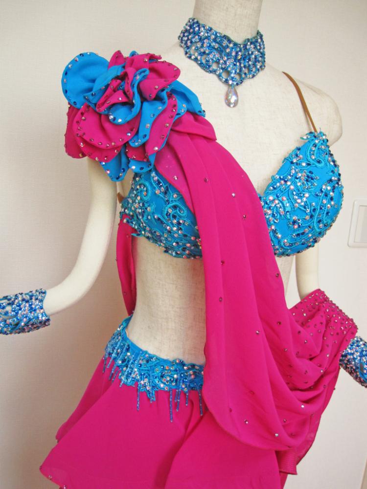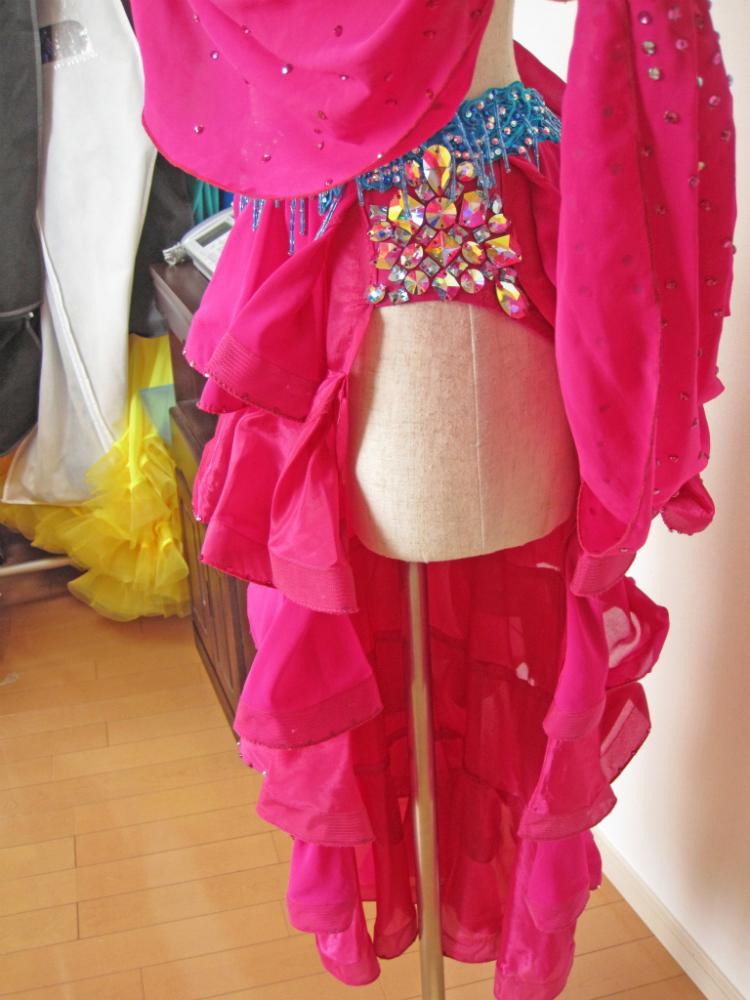 セパレートです。しかし、ドレープがついており、体のラインはカバーしてくれます。胸に大きな花がついており、相対的に顔が小さく見えるデザインです。スカートはくるぶしぐらいまでの長さですが、左側は開いており、脚の動きが良く見えます。スカートはツヤのある生地とマットな生地を交互に重ねており、それぞれの裾にホースヘアーが入っています。ボリューミーで良く踊ります。