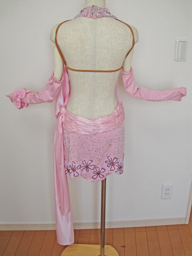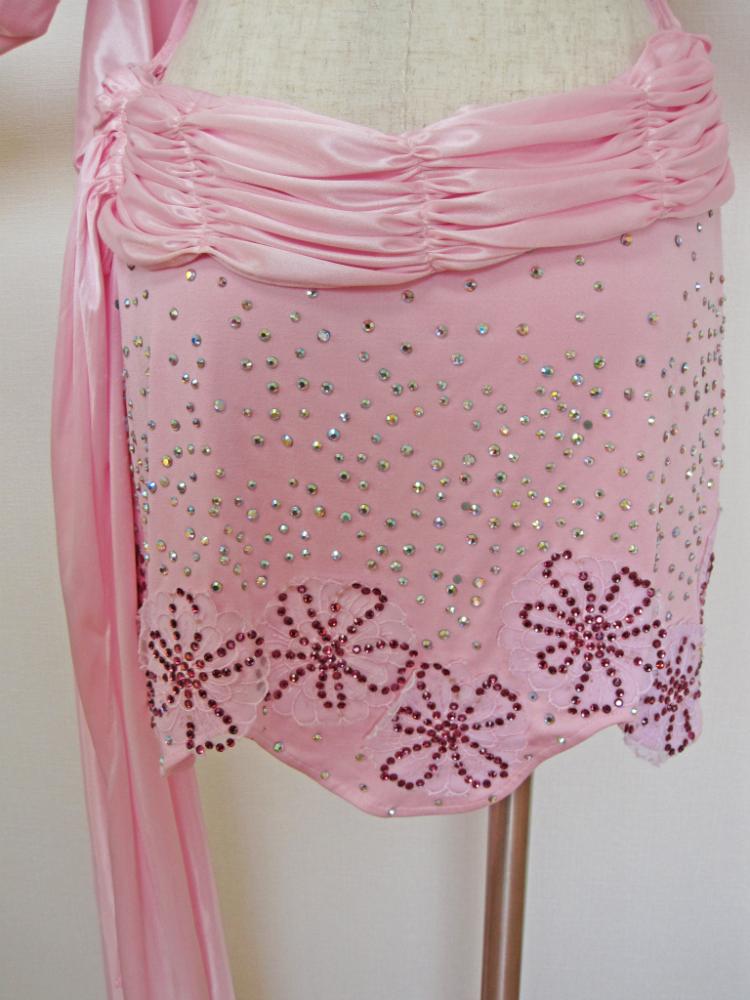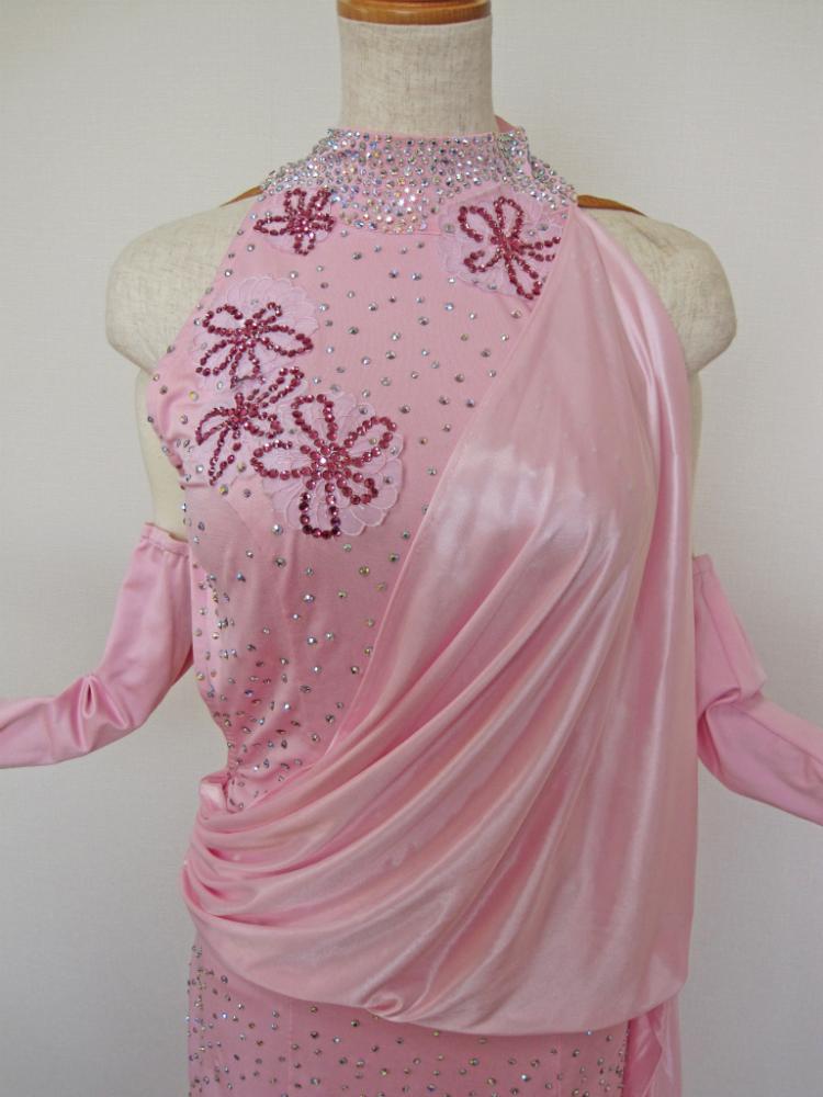 花をイメージしたピンク色のドレスです。首元にはスワロフスキーのストーンがびっしり飾られており、ボディにも石が散りばめられています。また、胸部分とスカートにはストーンで花が描かれていて、腰の部分も大きなリボンになっていてとても可愛らしいです。