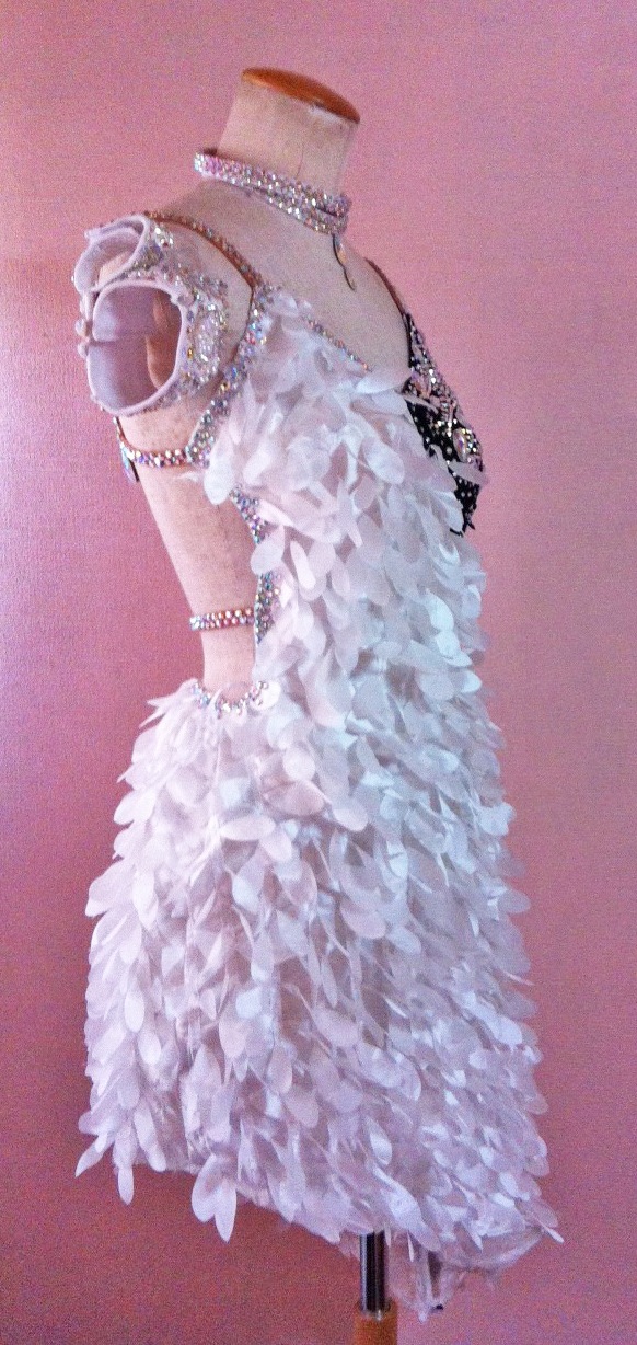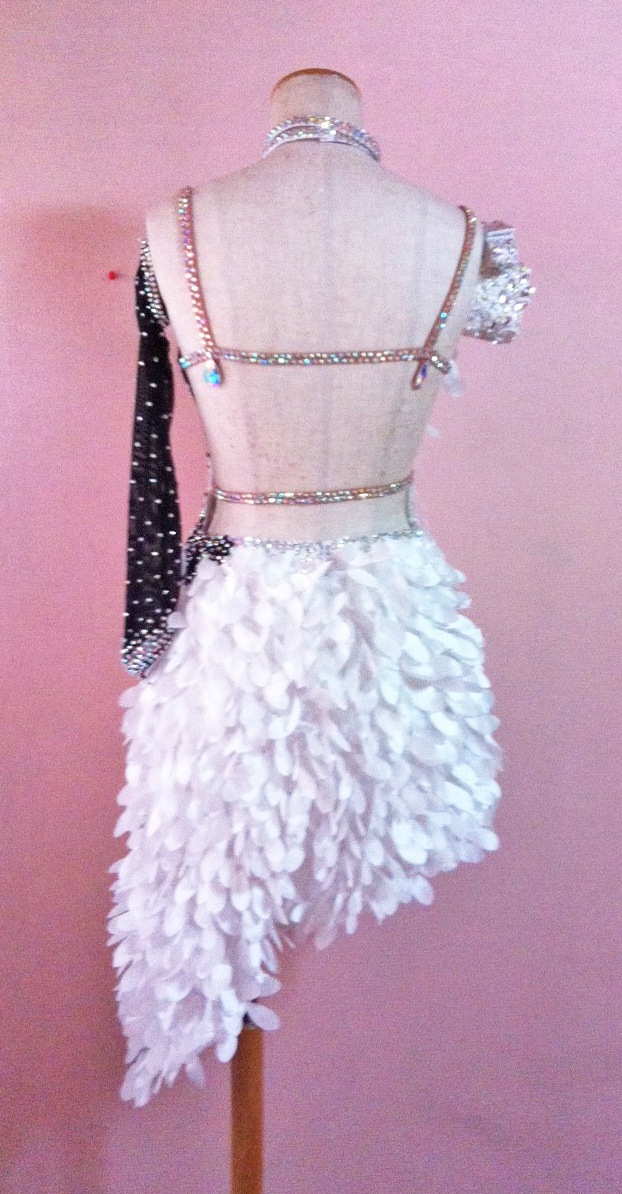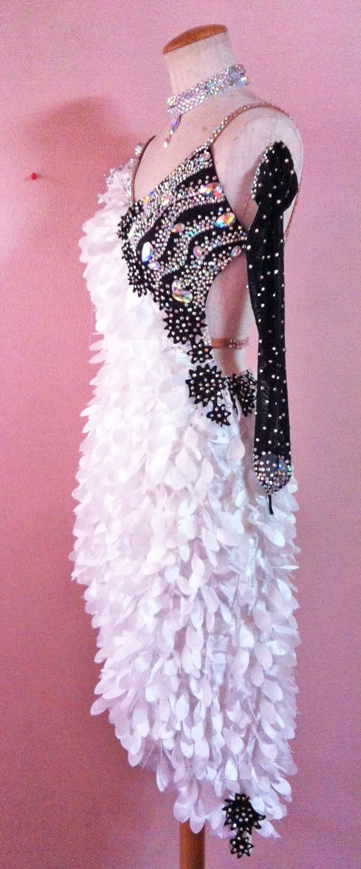 個性的な生地を使用してよく動ぎます。大量のラインストーンを使っていてとても豪華です。また白と黒の組み合わせで大人っぽい印象のドレスです。