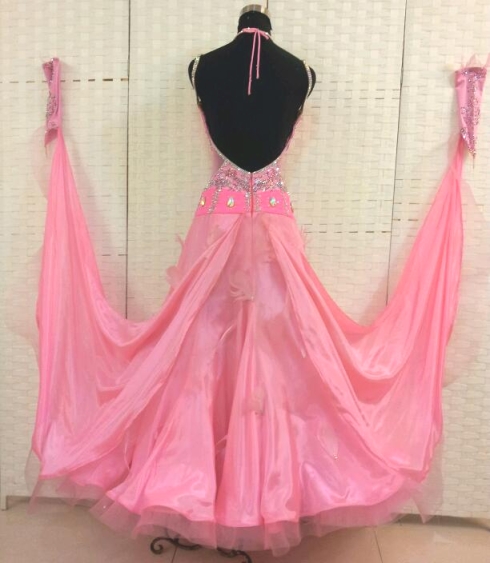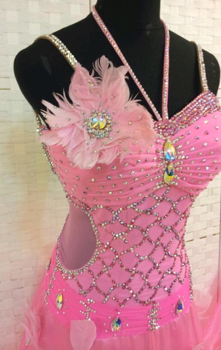 可愛らしいピンクのドレスです。胸元はギャザーがよっていてバストアップ効果があります。ボディにはスワロフスキーのストーンで編み目模様が描かれています。胸元や肩紐、ネック、ヒップまわりにもたくさんのストーンが使われています。生地はクリスアンのものが使われ、スカートには羽根が散らされています。