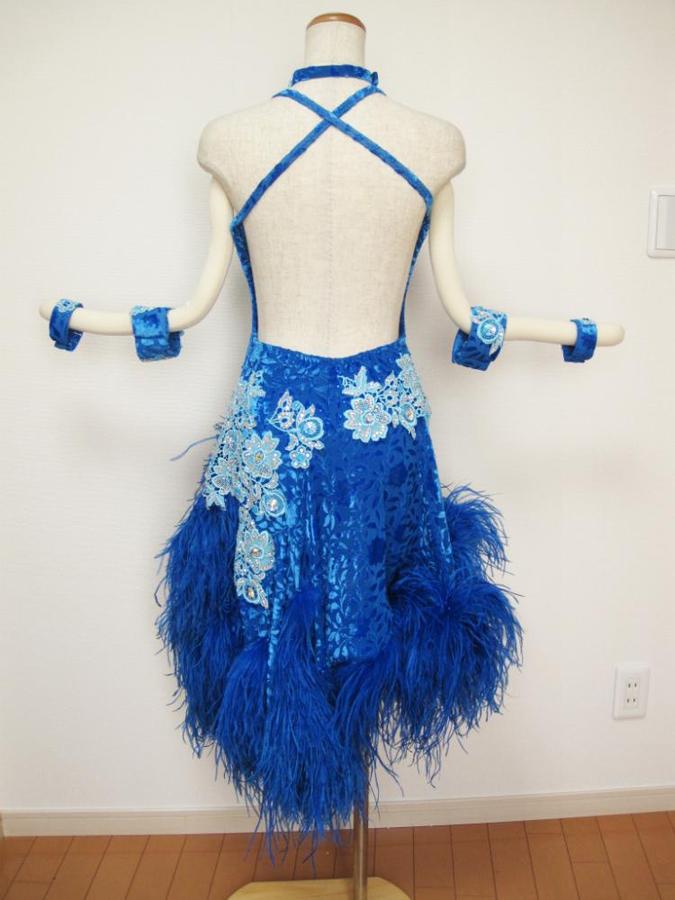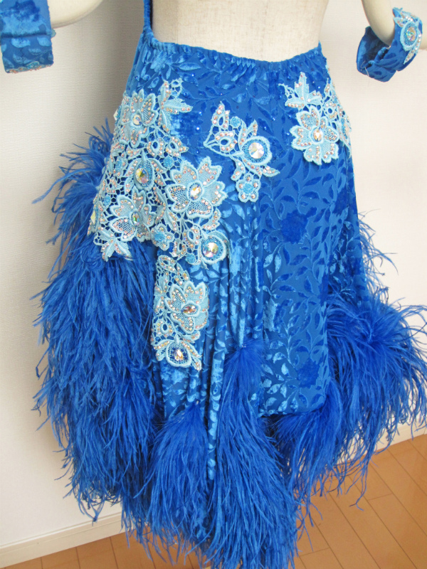 花柄のベロアのボディにオーストリッチの裾がたっぷりつけられたドレスです。ボディやアクセサリーには水色のモチーフがはられ、ストーンやビーズがたくさん貼られています。