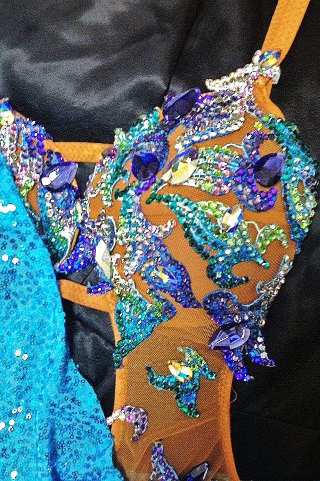 ターコイズブルーのスパン地に紫から緑の石のグラデーションが豪華なドレスです。使用回数が少なく、とてもきれいな状態です。