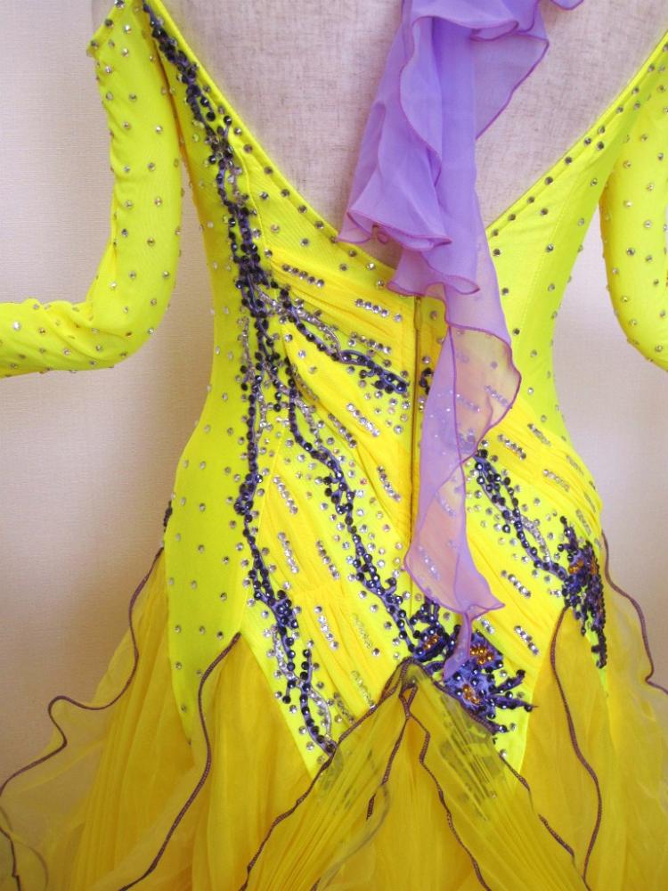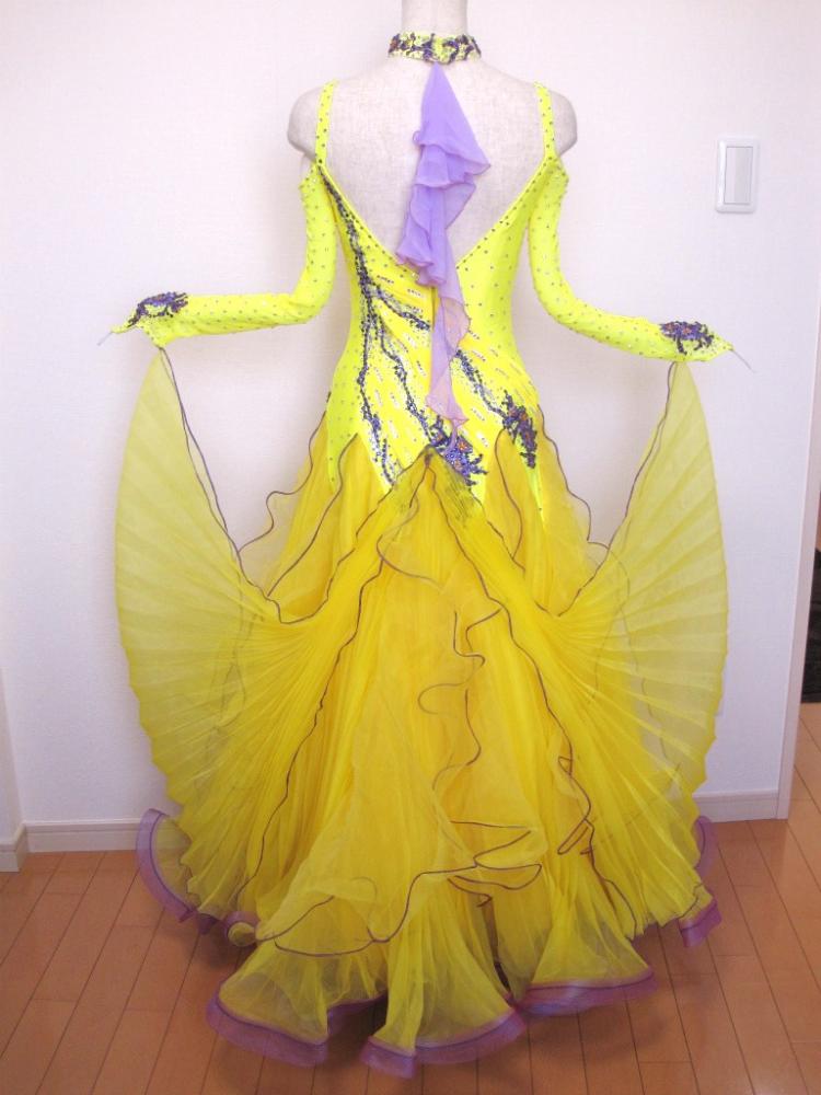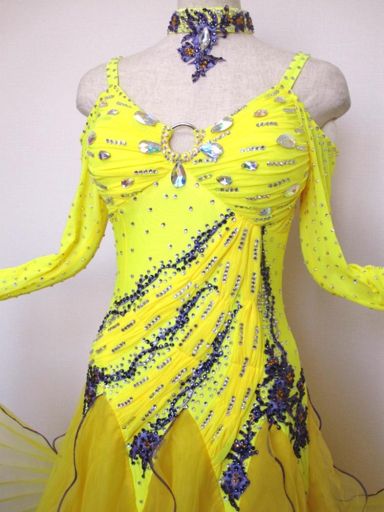 黄色に紫のモチーフ、ストーン、縁取りがアクセントになっているドレスです。寄せられたギャザーのライン状に貼られたモチーフとストーンがボディラインをしっかり見せて、メリハリのある体つきに見せてくれます。