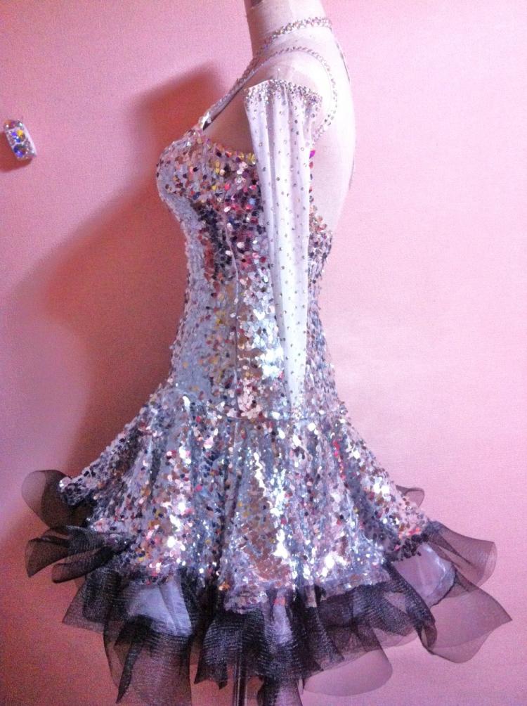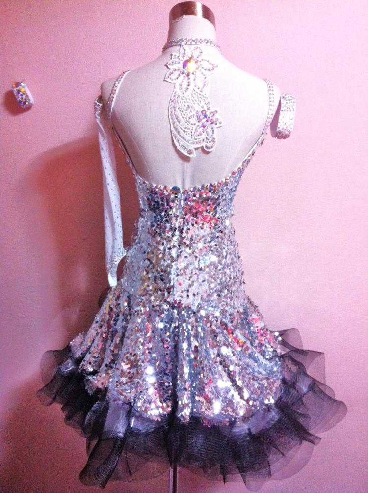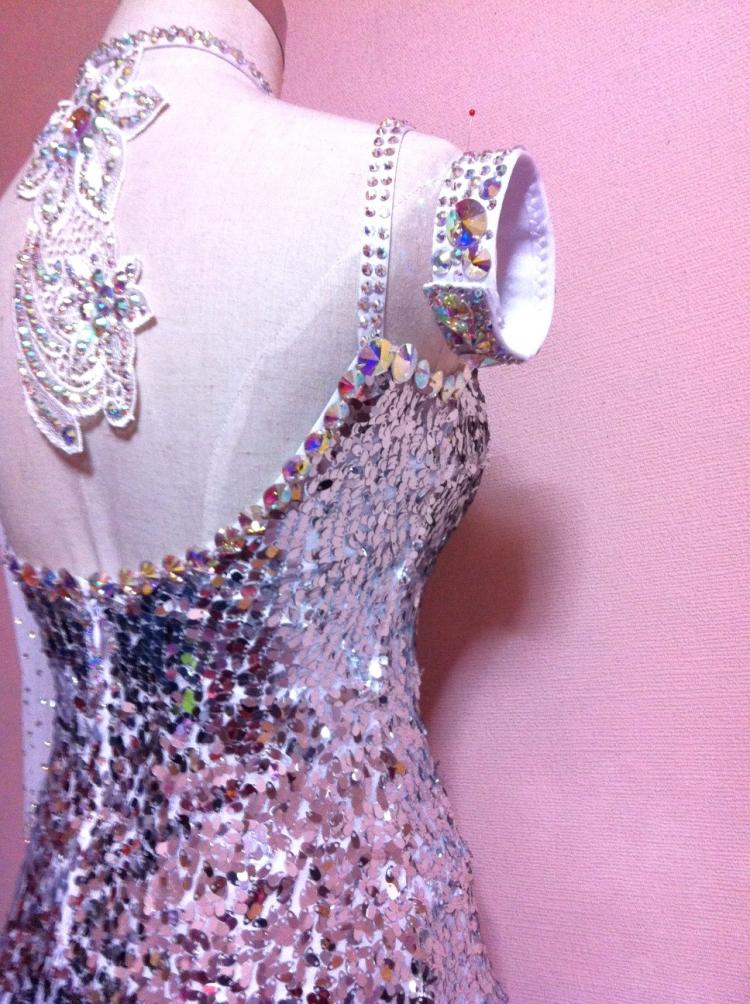 シルバーのスパンコールがフロアでよく目立ちます。バストの周りにスワロフスキーのストーンが使われ豪華です。スカートの裾にはホースヘアがついており、大きく広がります。